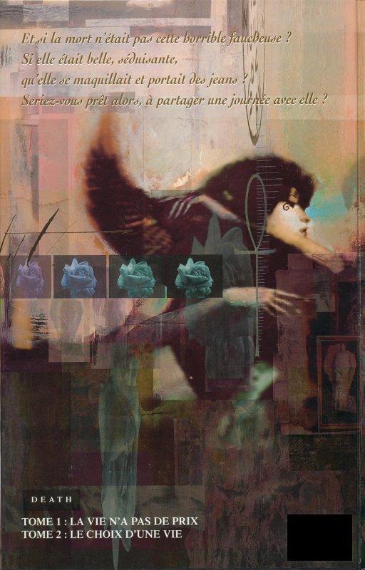 La première apparition de Death, en tout cas sous ces traits de punkette optimiste, eut lieu dans le 2e tome de Sandman, déjà écrit par Neil Gaiman, "Nocturnes", publié chez Vertigo (et en français chez les défuntes Editions Le Téméraire). Dream, après avoir enfin recouvré la liberté et ses pouvoirs après un emprisonnement de près de 70 ans, se sentait un peu vide de sens, au point que sa soeur est venue pour lui (et oui, vous pouvez en conclure à quel point Dream se sentait mal).